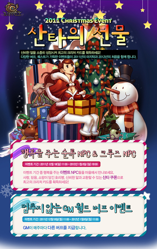 더불어 이벤트 기간 동안 매주 다른 버프를 지급하는 GM월드 버프 이벤트도 진행된다. `라펠즈` 를 담당하고 있는 박찬우 실장은 “독특하고 다양한 종류의 강력한 크리처(소환수) 시스템이 매력적인 `라펠즈` 에서 최고의 크리처 카드를 획득할 수 있는 다양한 버프와 퀘스트가 가득한 이벤트를 준비했다며 이번 이벤트를 통해 더 신나는 크리스마스가 되길 바란다” 고 전했다.