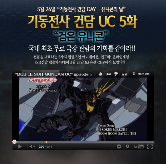 특히, 이 날에는 건담 애니메이션 ‘기동전사 건담 유니콘 5화’ 가 국내에서 최초로 상영될 뿐만 아니라 선발된 1,600명에게 무료로 관람할 수 있는 기회가 주어져 건담 마니아들 사이에서 입소문을 타고 있다.