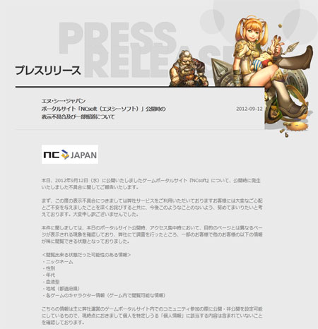 NC재팬이 운영하는 게임포털에서 이용자의 개인정보가 유출되는 사건이 발생했다. 일본 산케이 신문은 12일 엔씨소프트 재팬이 운영하는 게임포털에 문제가 발생해 이용자의 개인정보가 유출됐다고 보도했다.보도에 따르면 유출된 정보는 거주지, 혈액형, 연령대, 성별 등이며 개인 이용자가 다른 이용자의 정보를 확인하는 것이 가능했다 제목 없음