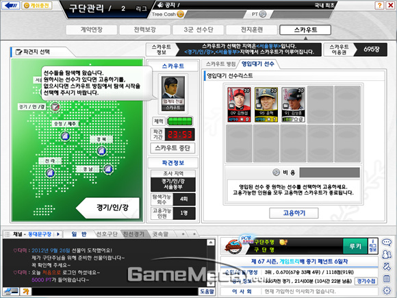 가령, 롯데 자이언츠의 1루수 선수카드가 필요한 이용자는 파견 지역을 부산으로 선택해 ‘1루수 선수를 조사범위에 추가한다’, ‘포수 선수를 조사범위에서 제외한다’, ‘두산 베어스 구단은 조사범위에서 제외한다’ 등의 구체적인 방침을 별도로 선택하면 된다. 그러면 스카우트가 방침에 맞는 선수들을 물색해오고, 이용자는 그 중 마음에 드는 선수를 선택해 영입하면 된다.
