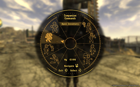 ‘컴퍼니언 휠’로 빠른 명령을! ‘폴아웃: 뉴 베가스’에는 플레이어를 도와줄 동료들이 무수히 많으며, 게임을 진행하는 도중 만나게 되는 NPC들을 설득과 대화를 통해 동료로 받아들일 수 있다. 동료는 플레이어와 함께 적을 공격하거나 무거운 장비를 대신 들어주는 등 다양한 역할을 수행한다.