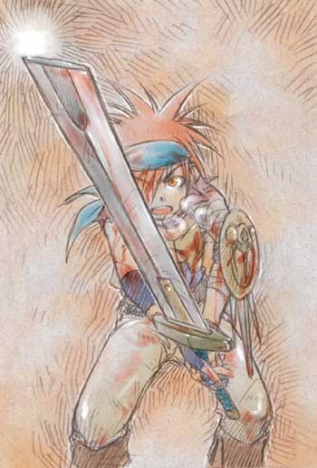 어두컴컴한 거대한 홀, 좌우에 놓여진 거대한 촛대만이 유일한 조명인 그곳에서 한 명의 검사가 인간의 형체를 지닌 거대한 그림자와 대치하고 있다. 한쪽 구석에서는 성직자로 보이는 엘프가 옆에 쓰러져 있는 마법사 차림의 여성에게 필사적으로 회복 주문을 외우고 있는 모습이 보인다. 방안 구석구석에는 불에 타고 칼에 베인 마물들의 모습들이 보여 방금 전까지의 사투의 흔적을 나타내고 있다.