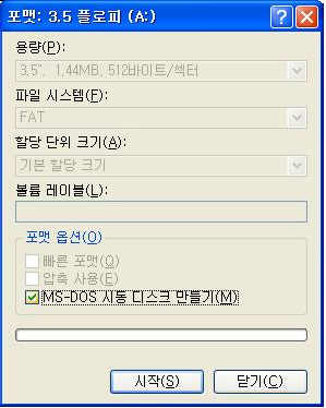 ntoskrnl.exe파일을 바꾸는 방법 1. ntoskrnl.exe 파일을 다운받는다. 다운받을 수 있는 곳은 지난 기사 마지막 부분에 나와있다. 2. 반드시 확인해야 할 점. 자신의 윈도우즈 XP에 서비스팩이 깔려있냐 그렇지 않느냐에 따라서 사용해야 할 ntoskrnl.exe 파일의 버전이 다르다. 서비스팩 설치 여부를 확인하고 반드시 그에 맞는 ntoskrnl.exe 파일을 다운받아야 한다. 3. 다운받은 ntoskrnl.exe 파일을 임의의 디렉토리에 복사해둔다. 4. 만일을 대비해서 3.5인치 부팅 디스켓을 만들어둔다. 부팅디스켓을 만드는 방법은 탐색기에서 A드라이브에 오른쪽 클릭하여 메뉴를 꺼낸 후 포맷 메뉴를 통해서 이루어진다.