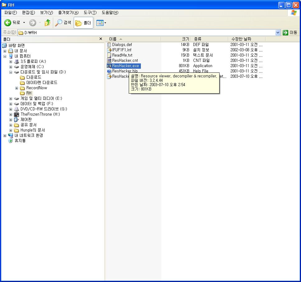 게임메카 자료실에 있는 리소스 해커를 다운받는다. 리소스 해커는 별도의 설치과정이 필요 없으며 다운로드 받은 파일을 임의의 디렉토리에 풀어놓고 실행파일 ResHacker.exe를 실행하기만 하면 된다.