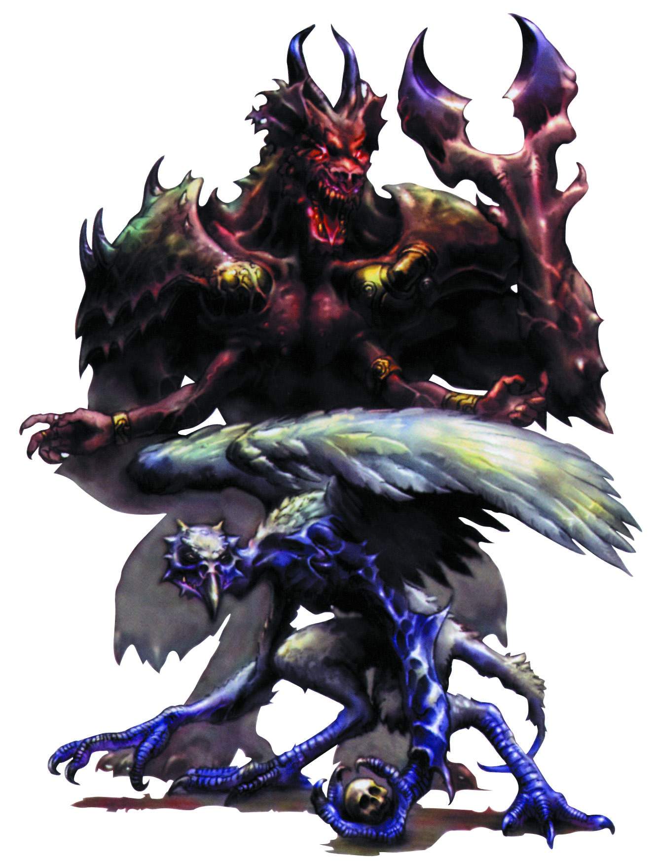 핏 피엔드, 바테주(Pit Fiend, Baatezu) 핏 피엔드는 바테주(Baatezu)의 리더, 즉 악마(Devil)의 우두머리이다. 약 12피트(3.6미터)의 키를 지닌 인간형에 박쥐 날개를 가진 몬스터로, 피부는 붉은색의 비늘로 덮여있다. D&D 3rd의 데이터에 따르면 그들은 25의 힘을 가지고 있으며 두 팔과 두 날개, 이빨과 꼬리를 이용해 1라운드에 총 6회의 공격을 한다. 이빨에는 강력한 독을 가지고 있으며, 꼬리 공격은 일단 성공할 경우 캐릭터가 성공적인 힘 판정으로 그것을 풀어내지 않는 한 계속적인 데미지를 가하게 된다. 물론 강력한 마법능력을 갖고 있으며 월 오브 파이어(Wall of Fire)로 자신의 몸을 감싸기도 한다. 또 하루에 두번 바테주를 소환할 수 있고 최고의 마법인 위시(Wish)를 1년에 한번 사용할 수 있다. 위시 마법은 소원하는 모든 것을 이루어주는 마법으로 핏 피엔드는 이것을 이용해 인간과 계약을 맺는다고 한다. 핏 피엔드는 전투 전에 향상된 투명화(Improved Invisibility) 마법으로 몸을 숨기고 적을 습격하는 비열함을 보여주기도 한다. 앞서 말한 바테주는 바토르라는 준법악(Lawful Evil)의 성향을 지닌 플레인(Plane: 차원 정도로 해석하면 편하다)에 사는 존재를 칭하는 말이며, 흔히 데빌이라고도 한다. |