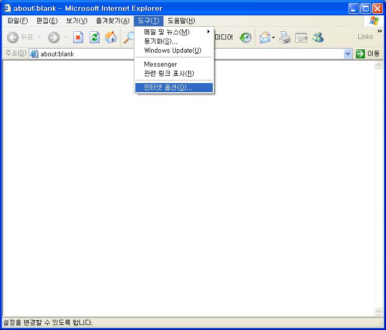 있는 인터넷 익스플로러를 통해 설명하겠지만 넷스케이프나 모자익 등 다른 웹 브라우저에서도 마찬가지 방법으로 설정하여 사용할 수 있다. 기본적인 원리는 HTTP Proxy 설정을 현재 컴퓨터, 즉 로컬호스트(localhost) 로 바꿔주는것이다. 먼저 도구메뉴의 인터넷 옵션으로 들어간다.
