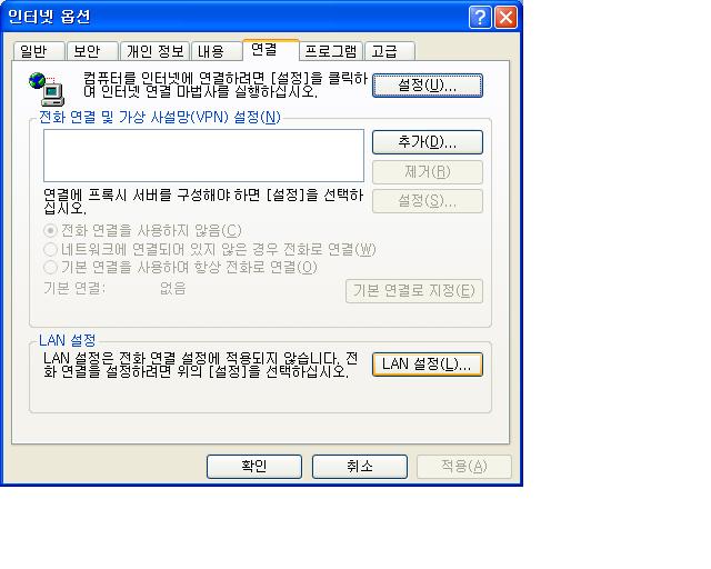 인터넷 옵션의 탭 중 '연결'을 보면 아래쪽에 'LAN설정'이라는 버튼이 있다.