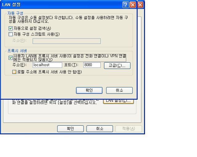 LAN설정 옵션으로 들어가면 아래쪽에 '프록시 서버'라는 항목이 있는데 '사용자 LAN에 프록시 서버 사용' 옆에 체크가 되어있지 않으면 체크해준다. 만약 이미 체크가 되어있고 아래쪽의 '주소'부분에 서버가 설정되어 있다면 그 설정을 메모해둔다. 그리고 '주소'에 'localhost'를, '포트'에 '8080'이라고 입력한 다음 '확인'버튼을 누른다.