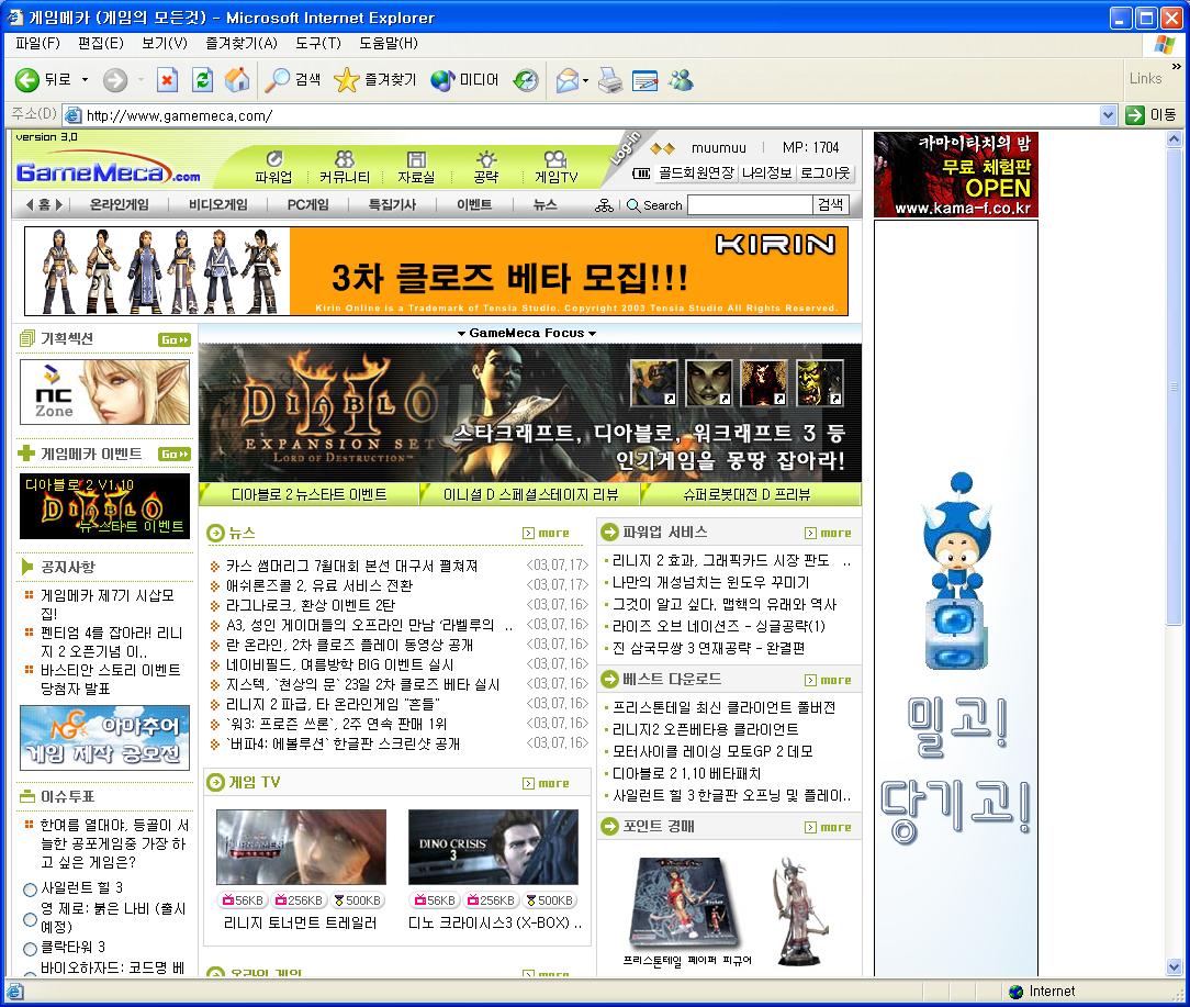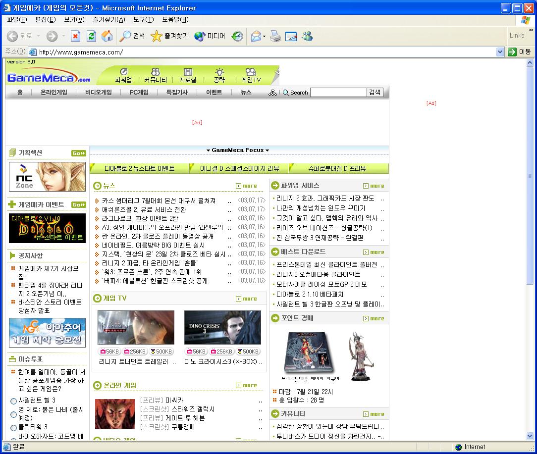 ▶ 프록소미트론을 적용하기 전의 게임메카 홈페이지 화면. 여러가지 플래시가 눈에 띈다 |