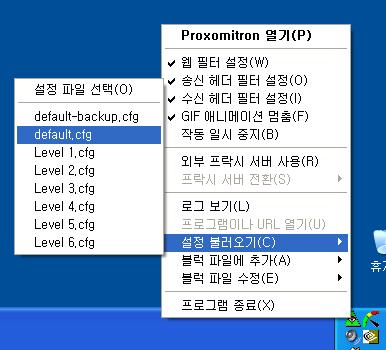 만약 프록소미트론의 필터링이 너무 강력하여 해당 페이지가 제대로 동작하지 않는다면, 시스템 트레이의 프록소미트론을 우클릭한 다음 '설정 불러오기'를 선택하여 필터링 레벨을 낮추도록 하자.