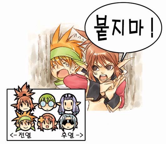 횃불에 비친 K의 얼굴을 보고 깜짝 놀라버린 혜지. 혜지의 비명소리에 일행은 모두 놀라 뒤를 돌아본다. 전열에서 앞장서 나가고 있는 것은 앞에서 나타날 위험에 대비하기 위한 전사 클래스인 승권과 셰리. 그 다음엔 로그(Rogue)인 찬희와 성직자 혜지, 그리고 마지막열을 따라오는 것은 체력이 약한 마법사인 K와 셀린이었다.