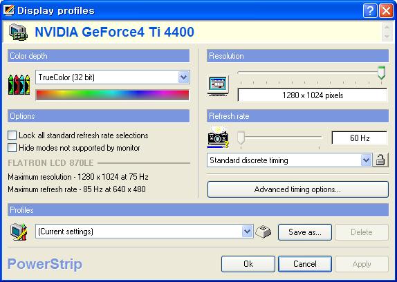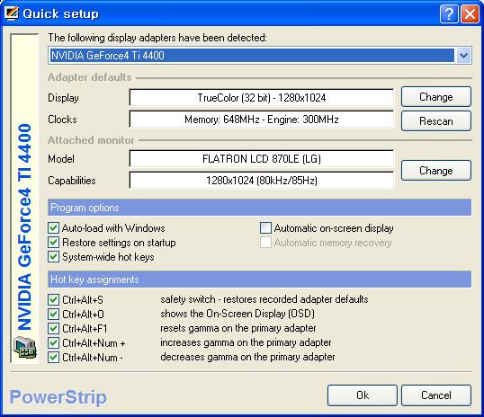 파워 스트립의 설정 화면이다. 왼쪽에는 현재 사용하고 있는 VGA의 명칭이 표시된다. 필자의 경우 지포스 4 Ti 4400을 사용하고 있으며 파워 스트립에서 정확히 인식하고 있다.