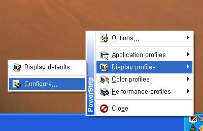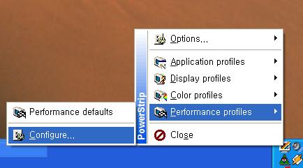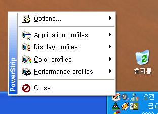 각 서브메뉴는 위에서부터 각각 Option, Application profile, Display profile, Color profile, Performance profile로 구성되어 있으며 맨 아래의 Close는 파워 스트립을 종료하는 메뉴이다.