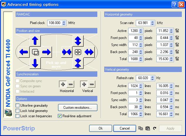 바로 아래쪽의 Advanced timing options 버튼을 누르면 리플레쉬 레이트나 기타 모니터 출력 주파수를 세부적인 단위로 조절할 수 있다.