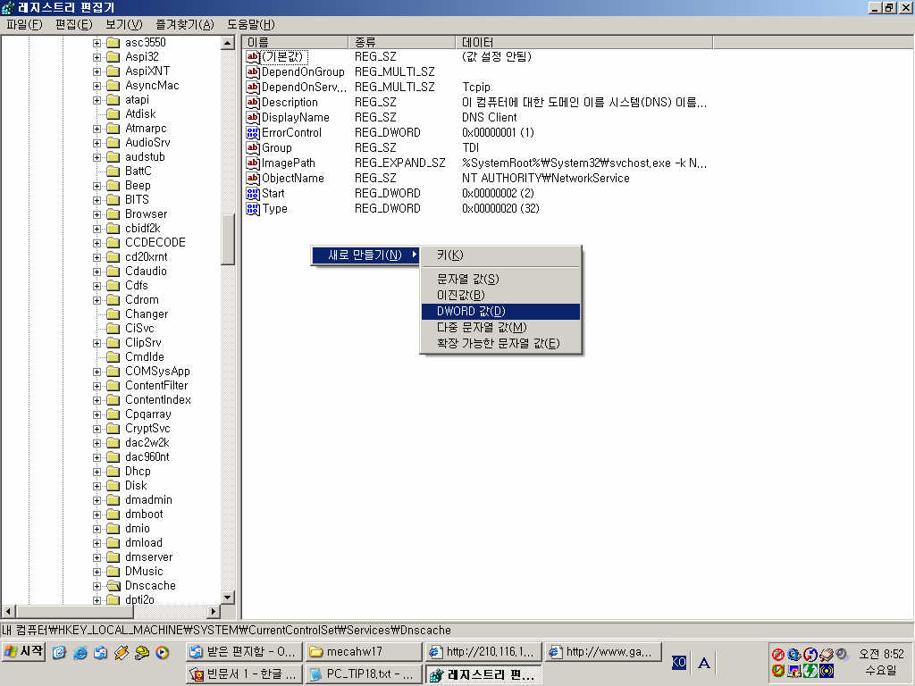 1) DNS 캐쉬를 수정한다. HKEY_LOCAL_MACHINESystemCurrentControlsetServicesDnscacheParameters에서 다음 항목의 값을 입력한다. 없다면 새로 오른쪽 마우스 클릭해 새로만들기->DWORD값-10진수로 만든다.