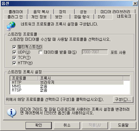 3. [네트워크 버퍼링] 항목에서는 버퍼를 10초로 지정한다. 다시 [네트워크] 탭을 누르고 [UDP] 항목의 체크 표시를 없앤다. [프록시 설정] 항목에서 HTTP를 마우스로 두 번 누른다. [프로토콜 구성] 대화 상자가 나타나면 [프록시 서버 이용 안함] 옵션을 선택한다.