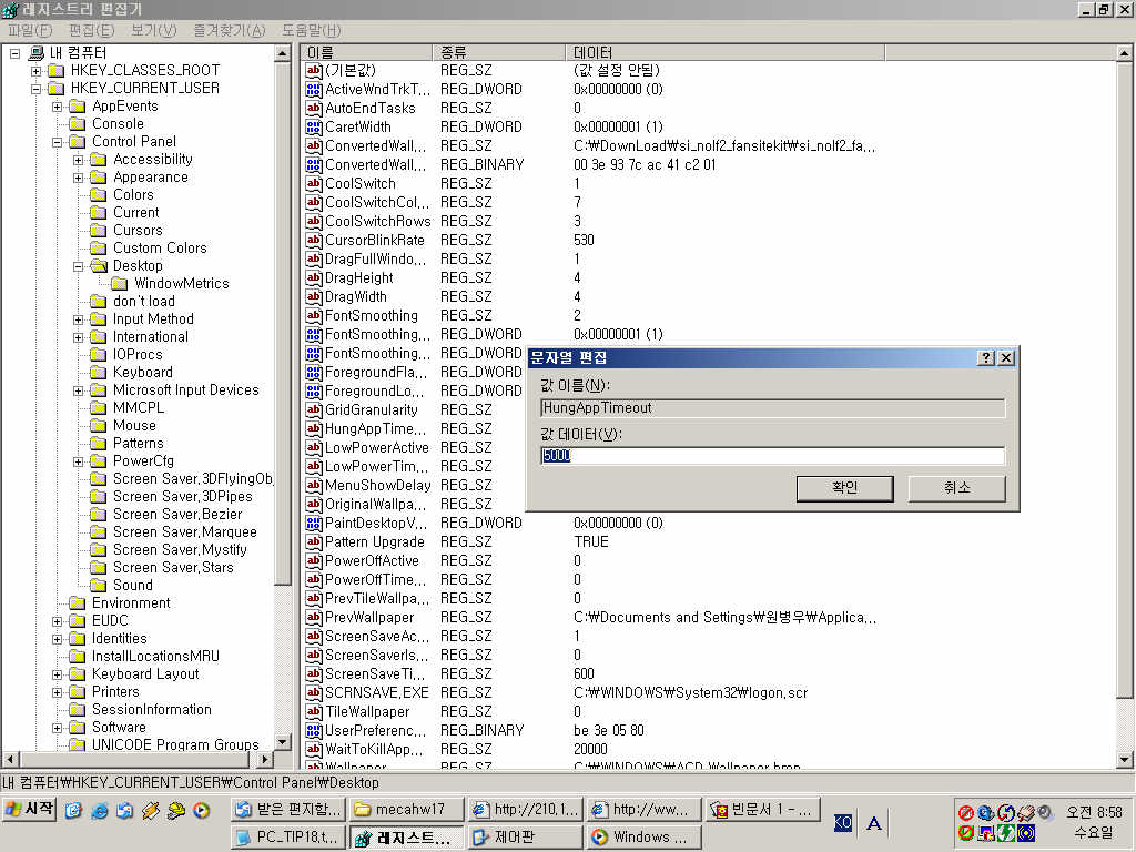 [HKEY_CURRENT_USERControl PanelDesktop]에서 오른쪽에 HungAppTimeout의 값을 수정한다.