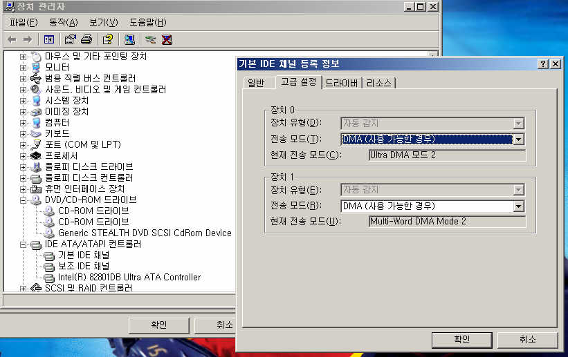 윈도우에서 하드디스크와 CD-ROM을 DMA 모드로 설정하는 건 필수다. E-IDE 드라이브의 인터페이스 컨트롤러에는 PIO 모드와 멀티워드 DMA(Direct Memory Access)라는 두가지 전송방식이 있다. 기존의 PIO모드에서는 데이터가 메모리에서 CPU를 거쳐 드라이브로 전송되지만 DMA모드에서는 데이터가 DMA 채널을 통해 CPU를 거치지 않고 곧바로 드라이브로 전송되기 때문에 전송속도가 높아지며 CPU 점유율 또한 현저히 낮아진다. 입출력을 위한 인터럽트의 횟수가 줄어들어 멀티태스킹과 고속작업이 유리하다. 동시에 여러개의 창을 띄워놓고 작업하면서 시스템이 심각하게 버벅거리면 DMA 체킹이 되어 있는지 반드시 체크하자.