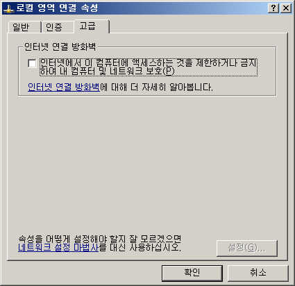 바탕화면의 네트워크환경의 등록정보를 연다. 자신의 네트워크 연결항목을 선택하고 마우스우측버튼을 클릭해서 등록정보를 열면 아래와 같은 창이 나오는데 고급-인테넷 연결방화벽을 체크하든지 체크아웃한다.