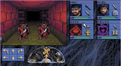 주시자의 눈 역시 6명의 그룹원을 끌고 다니는 RPG였습니다. 도시의 지하 던전에 살고 있는 비홀더를 처치하는 것이 주목적이었던 이 게임에서는 100% 던전속(2, 3편에서는 던전을 약간 벗어나긴 하지만 그래도 던전이나 마찬가지의 지형이었습니다)을 모험합니다. 그렇기 때문에 앞서 말했듯 전열에 2명, 중간에 2명, 후열에 2명이 서서 던전속을 탐험하죠.