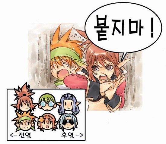 ▶ 지난 연재에서 나왔던 그룹 구성. 전열이 승권(전사), 셰리(전사), 중간열이 혜지(성직자), 찬희(도둑), 후열이 셀린(마법사), K(마법사)로 이루어져있다. |