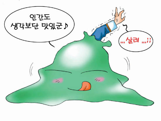 네. 그것은 인체든 강철이든 모든 녹여버리는 슬라임이었습니다. 만약 제가 거기서 진짜로 찍어서 맛을 봤다면…. 손가락이 녹아버리고, 온 몸이 빨려들어 슬라임의 영양분이 되었겠죠? 이런 식으로 별거 아닌 몬스터라 해도 마스터가 얼마나 잘 활용하는가에 따라 강력하게 변할 수 있는 것이 바로 TRPG의 묘미라 할 수 있습니다. 자, 그럼 독자님도 한번 그 친구분을 골탕먹일 계획을 세워보시면 어떨까요? 마지막으로 먼치킨이 무엇인지 모르는 독자분을 위해 지난 3월호에 나왔던 먼치킨에 대한 설명을 곁들이면서 끝내도록 하죠.