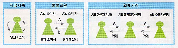 고기나 생선 등 쉽게 부패할 수 있는 물건은 주고 받을 수 있는 시기가 한정되어 있고, 또한 가까이에 자신이 원하는 물건을 가진 사람이 없거나, 있어도 상대편이 자기가 가진 물건을 원하지 않으면 거래가 성립될 수 없다는 물물교환의 문제점 때문에 사람들은 새로운 대안을 만들어냈다. 물건들의 가치를 공통된 기준으로 표현하고자 하는 시도, 즉 화폐(돈)라는 개념이 탄생한 것이다. 그리고 화폐의 등장과 더불어 유통을 업으로 삼는 유통업자들이 생겨났다. 자신이 남는 물건을 주고 화폐로 받은 다음, 자신이 필요한 걸 갖고 있는 사람에게 화폐를 주고 물건을 받는 화폐거래 구조. 이로 인해 자기가 원하는 물건을 갖고 있는 동시에 자기가 갖고 있는 물건을 원하는 사람을 찾아야하는 물물교환의 번거로움이 단숨에 해결되었다. 또한 생산자가 소비자를 찾아서, 혹은 소비자가 생산자를 찾아서 이동해야 하는 번거로움을 덜기 위해 생산자에게서 화폐를 주고 물건을 산 후, 소비자에게 화폐를 받고 물건을 파는 유통업자들이 생겨났다. 단순히 생산자가 유통을 겸하던 물물교환의 시대에서 유통업자가 생산자와 소비자를 잇는 가교 역할을 담당하는 보다 전문화, 세분화된 구조가 탄생한 것이다.