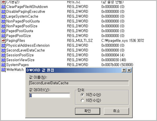 에서 오른쪽에 SecondLevelDataCache항목을 고른다. 자신의 CPU에 맞는 10진수 값을 다음과 같이 수정한다.