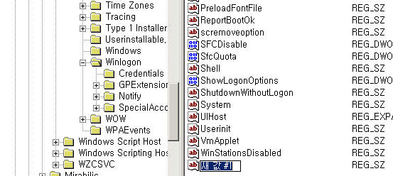 HKEY_LOCAL_MACHINE/SOFTWARE/MicrosoftWindows NT/CurrentVersion/Winlogon항목에서 오른쪽마우스 클릭하여 [새문자열값] 으로 다음값을 등록.