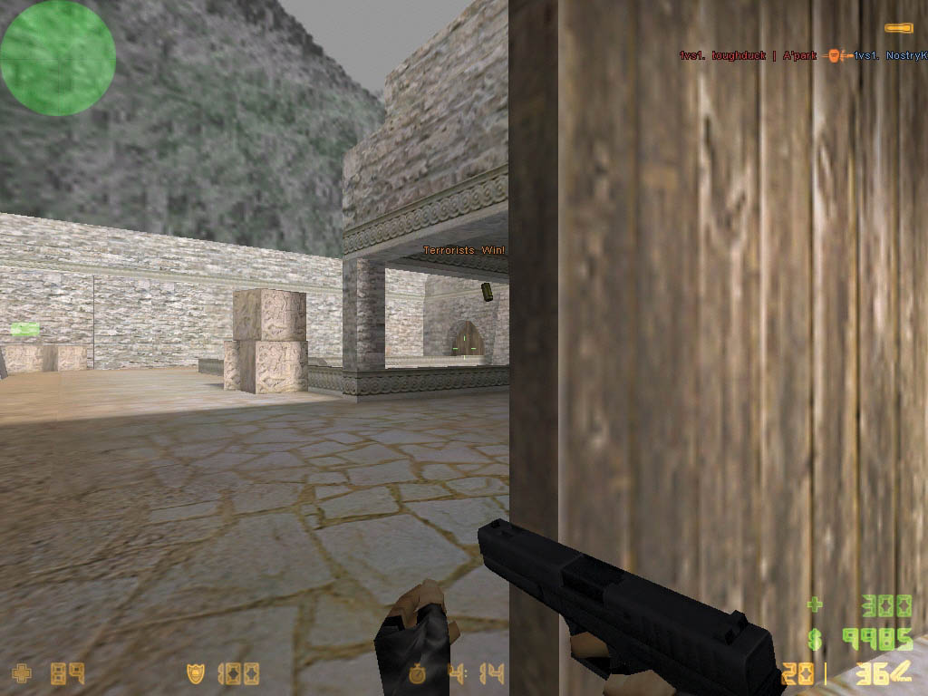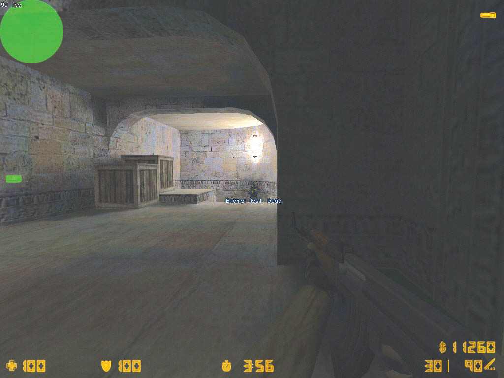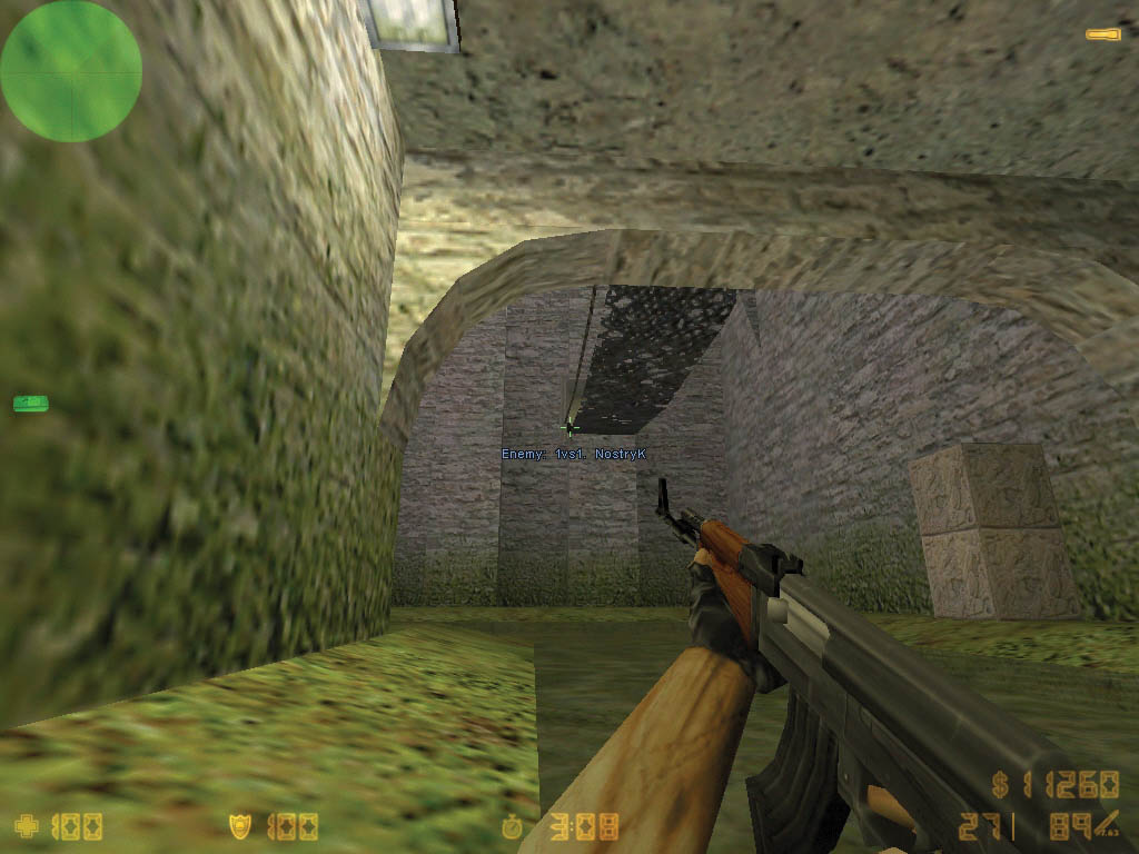 TR의 HE 3~4개면 다리 안에 있는 CT는 전부 몰살이다. CT의 경우 AWP에 자신이 있다면 그림과 같이 내밀어서 치고 빠지기를 반복하자. 언급했듯이 빠지지 않고 계속 내밀고 있다면 적의 HE폭탄과 총알세례를 받을 것이다.
