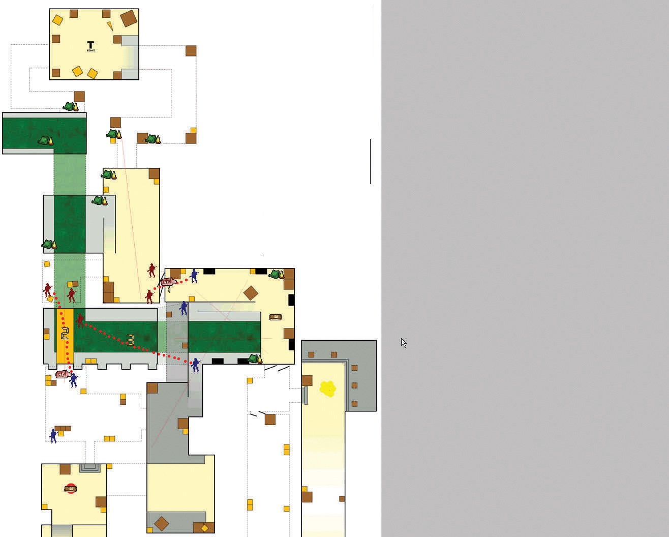 TR은 스폰이 좋아 전진을 하게 되면 대각선 방향에서 나오는 CT와 마주치게 된다. TR이 1번 지역의 동굴 안으로 전진을 했다면 일단 플래시뱅을 하나 던져 CT의 눈을 멀게 해줘야 한다. 그렇지 않으면 얼굴을 내미는 순간에 CT의 총알세례에 바닥에 누워버리기 쉽다. 또한 동굴 안으로 전진했다면 최대한 빨리 전방에 보이는 박스로 숨어야 한다.