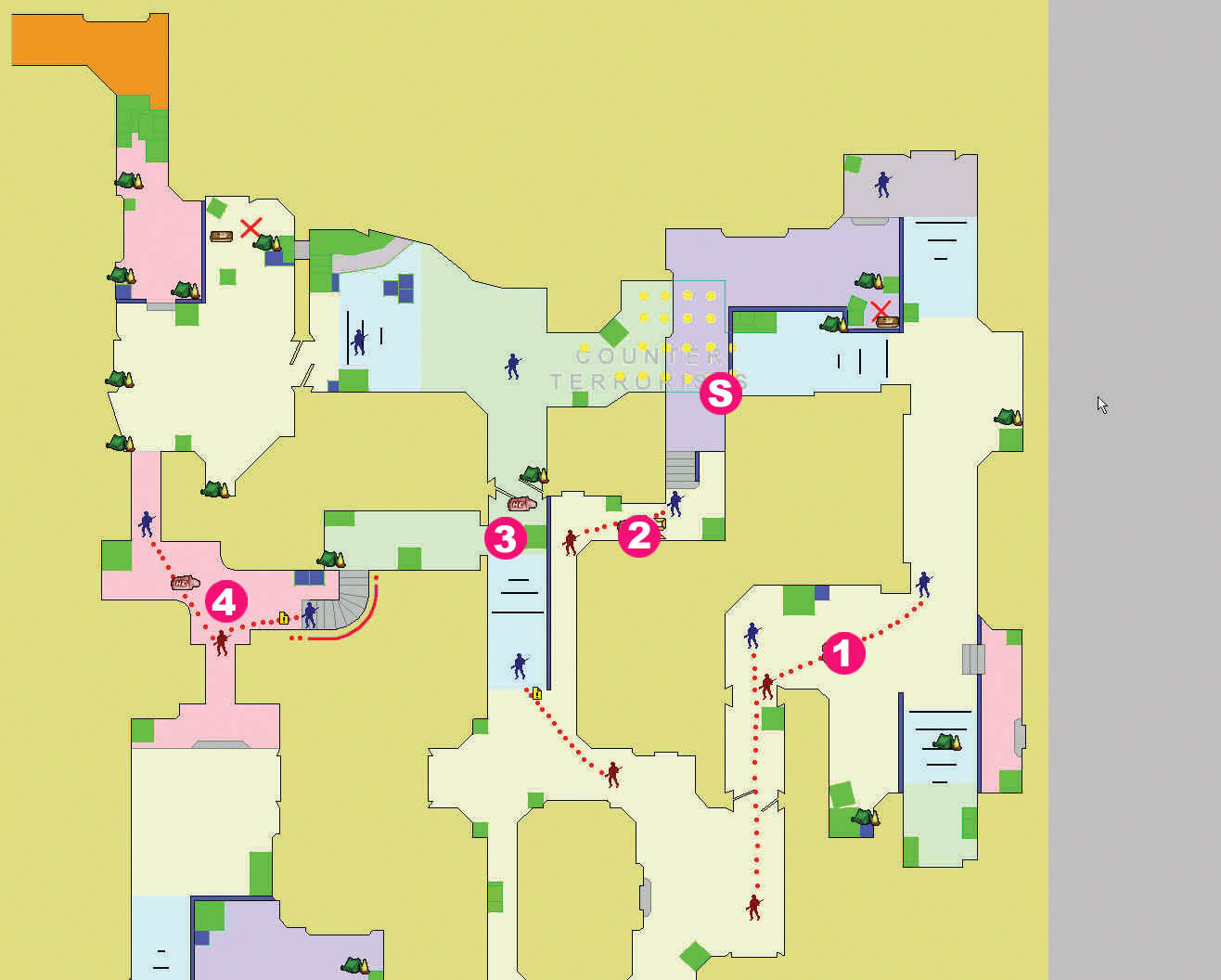 무작정 C4 지역 쪽만을 바라보면서 달려가다가는 계단으로 전진한 CT에게 몰살당한다. 4번 지역 C4존으로 전진할 때는 구석구석을 꼼꼼히 살펴야 한다.
