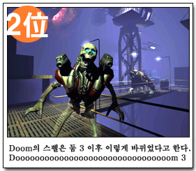 듀크뉴켐 포에버 정도는 아니지만 둠 3 역시 듀크뉴켐과 더불어 출시연기계의 두개의 탑이라 할 수 있을 정도로 남부럽지 않은 출시연기 실력을 보여주고 있다. 물론 그동안 퀘이크 시리즈를 만드느라 정신이 없었다고는 하나 벌써 10년이다. 1994년 둠 2 출시 이후 올해로 딱 10년을 맞은 둠 3는 그동안 E3 쇼 등을 통해 관련 동영상을 ‘배다른 동생 용돈 주듯’ 찔끔찔끔 공개하며 FPS 팬들의 관심을 끄는 데는 성공하고 있지만 과연 그 동영상을 보면 이게 게임소개를 하는 것인지 엔진 자랑을 하는 것인지 그래픽카드 회사 홍보를 대신해주는 것인지 헷갈릴 때가 많다. 존 카맥이 가지고 있는 페라리 테스타로사 만큼이나 빠르게 작업한다면 2004년에는 충분히 모습을 보일 것이라 생각되지만 듀크뉴켐의 전철을 밟지 않는다고는 아무도 말 못한다. |