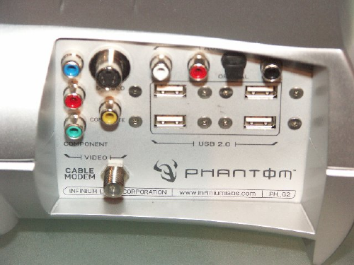 광학식 드라이브를 탑재하지 않았기 때문에 본체 전면부는 아주 깔끔한 편이고 전원을 넣으면 본체 전면부에 Phantom의 로고가 파랗게 떠오르기 때문에 디자인적으로도 보기에 좋다. 한편 본체 뒷면에는 각종 단자가 준비되어 있다. 비디오 출력은 3핀의 콤포넌트, S-VEDIO, 콤포지트 비디오 등 세 종류가 준비되어 있으며 아날로그 음성출력 단자는 2채널이지만 광음성 출력단자 경유를 통해 돌비 디지털 5.1채널 사운드를 지원한다. 본체에는 RF 방식의 와이어리스 모듈(무선 모듈)이 내장되어 와이어리스 타입의 컨트롤러와 키보드, 마우스를 사용할 수 있다. 본체 뒷면에는 USB 2.0 단자를 4개 갖추고 있는데 이쪽은 컨트롤러 증설용으로 생각하면 될 듯. 여기에다 10BASE-T/100BASE-TX에 대응되는 LAN 커넥터, 케이블 모뎀 접속용 커넥터도 구비하고 있다.