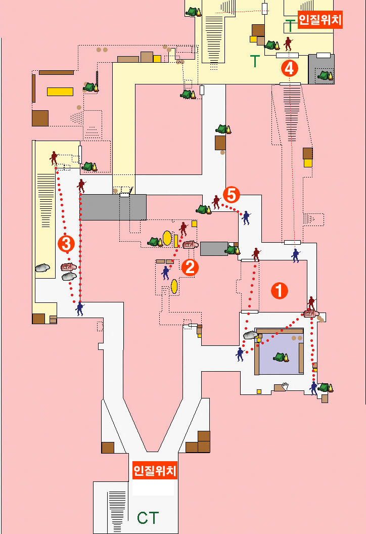1번 지역마저 차지하지 못한 상태에서 이 지역마저 내눈다면 CT에게 희망은 없다. 몸을 내밀기 전에 쿠션을 이용해 위쪽과 아래쪽으로 동시에 하나씩 플래시뱅을 던진 다음 기습적으로 공격을 가하는 것도 좋은 방법이다.