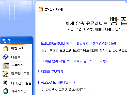 지금 소개할 빵집은 국내의 한 프로그래머가 개인 수준에서 공개한 프로그램이다. 다양한 종류의 압축프로그램을 지원하며 인터페이스가 간결하고 무엇보다 ‘완전한 무료’다. 개인이든 집단이든 회사든 아무런 제약 없이 사용할 수 있다는 점은 큰 메리트다. 빵집은 공식 홈페이지에서 다운로드 받을 수 있으며 주소는 http://www.bkyang.com이다.