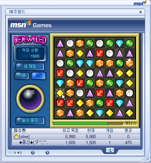*비쥬얼드 전략 MSN에서 가장 인기있는 종목중의 하나인 비쥬얼드는 다양한 전략이 존재한다. 그중에서도 가장 정석인 방법은 일명 “아래서부터 족쳐 연사를 노려라”(필자가 지어낸 것이니 태클은 사절이다)라는 방법이다. 비쥬얼드에서는 3개씩 없애는 것보다는 4개, 5개씩 없애거나 한 번에 다수의 줄을 처리하는 것이 점수를 더 많이 획득한다. 이것을 이용한 방법으로 줄의 가장 아래에서 세로방향으로 없애기 시작하면 보석들이 한 번에 우르르 내려오게 마련이다. 그러다 보면 자연스레 위의 것들이 아래 것들이 겹쳐지는 경우가 생겨 연쇄가 발생한다. |