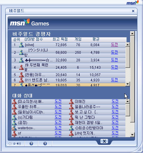 하지만 MSN메신저의 등수는 그렇지가 않다. 일단 메신저에 등록되어 있는 모든 사람들의 게임횟수, 결과, 등수까지 나온다. 이것은 무척 아이러니한 기분을 느끼게 해주는데 자기주변의 사람들의 게임결과가 무척 재미있을 뿐만 아니라 왠지 모를 강렬한 투쟁욕구까지 일으켜준다. 또한 말만 잘하면 “한턱 쏴”라고 말할 수 있는 구실도 되니 정말 쓸만하지 않은가?