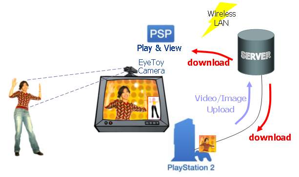▲ 아이토이와 PSP를 이용한 다양한 엔터테인먼트의 세계. 아이토이로 찍은 동영상을 PS2를 통해 서버로 업데이트하고, 이를 PSP의 무선 네트워크 기능을 이용해 다운받은 후 보거나 감상할 수 있다 |
