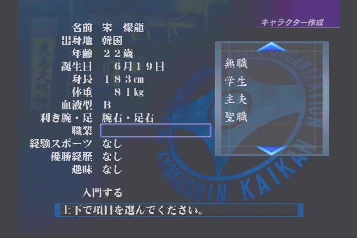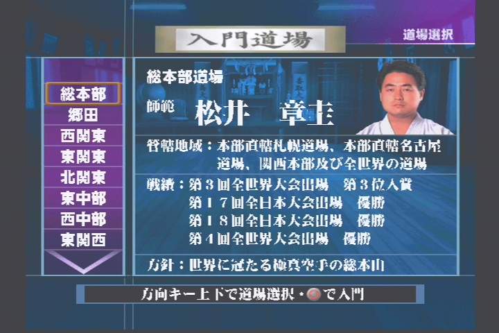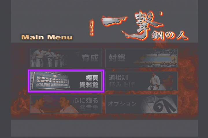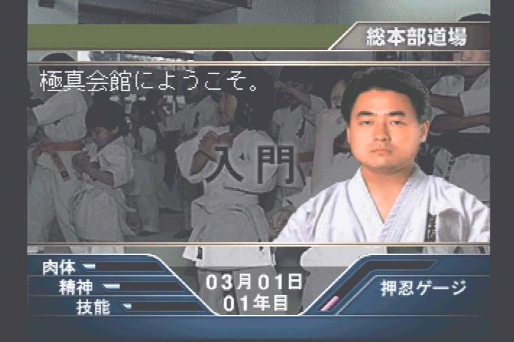 극진 가라데에 대한 짤막한 설명과 함께 이내 메인 메뉴가 표시된다. 육성, 대전,