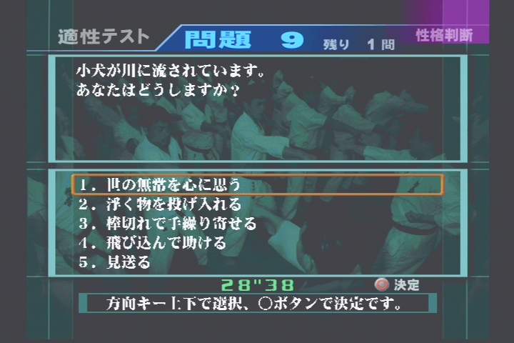 문제는 바로 여기부터다. 질문에 이어 보기로 주어지는 답들이 실로 기상천외하기 때문. 친구가 돈을 빌려가 갚질 않는다며 어떻게 하겠냐는 질문에 ‘일격(을 먹인다)’, ‘그냥 적선한 셈 친다’, ‘무서운 사람에게 부탁한다’, ‘담보를 뺏는다’ 중 하나를 고르라고 하지 않나, 강물에 떠내려가는 강아지를 보고 어떻게 할 것이냐는 질문에 ‘인생무상을 떠올린다’, ‘붙잡을 걸 던져준다’, ‘긴 막대기를 이용해 이쪽으로 끌어온다’, ‘빤히 바라본다’ 중 대답을 고르라고 하는 등 실로 발칙하고 엽기적인 내용들로 가득하다.