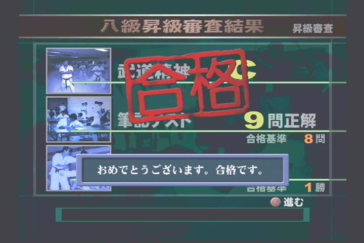 그리고 또 한 가지 문제는 플레이어의 실력이 아닌 캐릭터의 실력에 따라 대전 결과가 명확하게 갈린다는 점이다. 육성 모드를 진행하면서 플레이어 캐릭터는 승급심사를 통해 10급부터 차례로 올라가게 된다. 그런데 급수가 낮은 상태에서 대회에 출전하면 급수가 높은 다른 상태에게 처참하게 깨져버린다. 10급의 캐릭터와 5급의 캐릭터에는 하늘과 땅 같은 실력 차이가 존재하는 건가? 다른 캐릭터들은 전부 2급, 1급, 초단, 3단 등 쟁쟁한 실력인데 게임 초반 9급, 10급에 불과한 플레이어 캐릭터는 대회에서 명함도 내밀 수 없다. 아무리 때려도 상급 캐릭터에겐 경미한 대미지밖에 줄 수 없고, 반대로 상대방에게 한 방이라도 맞으면 체력은 몽땅 줄어버리고…. 결국 플레이어는 게임초반 출전하는 대회마다 족족 지는 짜증나는 플레이를 강요당하며 어느 정도 캐릭터가 성장할 때까지 이 지겨운 과정을 반복해야 한다.