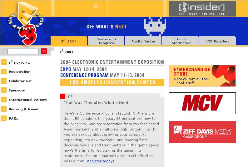 세계 곳곳에서 열리는 게임 관련 행사 중 가장 큰 규모의, 그리고 가장 많은 주목을 받는 명실상부한 세계 최고의 게임 전시회 Electronic Entertainment Expo(이하 E3)가 1주일 앞으로 다가왔다. 5월 12일부터 14일까지 열리는 이번 E3 2004는 계속해서 큰 성장률을 보이고 있는 세계 게임산업의 향후 동향을 파악할 수 있는 좋은 기회자 서서히 수면 위로 떠오르고 있는 콘솔 게임기의 후계기종 소식으로 인해 그 어느 때보다 게임 관계자들의 관심이 높은 게 사실.