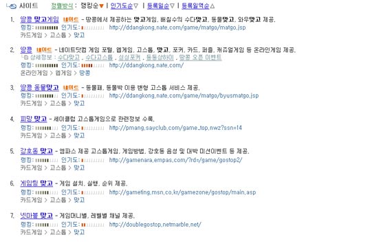 '맞고'를 검색하면 저렇게 많은 서비스가 검색된다. 인기실감!