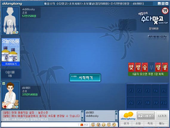 맞고를 치기 위해서는 서버와 게임룸을 선택해야 하는데 일단 초보방은 판돈 게임머니가 두 종류로 나뉜다. 새롭게 시작하는 사람이거나 가볍게 즐기기를 원한다면 500원방으로 빠른 게임머니 획득을 통해 등급 업을 노린다면 1,000원 방으로 가자.