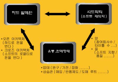 하지만 그것만으로 충분할까요? 저는 그렇게 생각하지 않습니다. 하드웨어와 소프트웨어에다 비즈니스 모델을 포함해서 논해야 합니다. 구체적인 예는 차차 이야기하겠습니다만, 비즈니스의 윤곽이 확실치 않은 게임기에서는 좋은 소프트가 나오지 않습니다. 그러므로 저는 비즈니스 모델에 특히 주목해야 한다고 생각합니다.