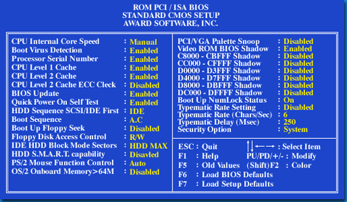 2) BIOS FEATURES SETUP : CPU와 관련된 세팅과 각종 장치를 세팅할 수 있는 부분이다. 특히 HDD 및 그래픽 카드를 세팅하는데 중요한 부분이 있기 때문에 눈여겨 봐야할 메뉴며 CMOS 컨트롤의 진정한 첫걸음이기도 하다.