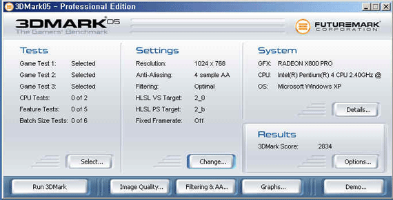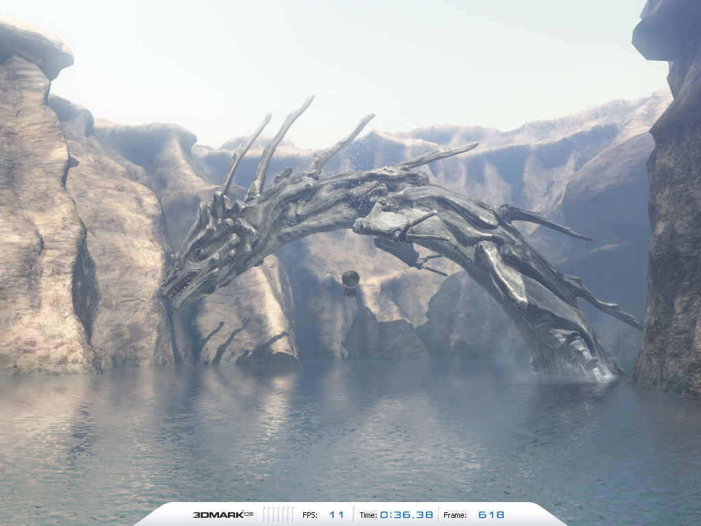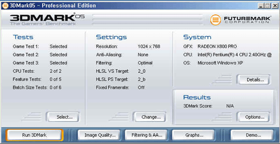 그래서 직접 눈으로 성능을 확인할 수 있는 벤치마크 프로그램을 사용하는 것이 일반적인데 보통 3D 성능을 체크하는데 많이 사용하는 3DMARK를 이번 테스트에 사용했으면 버전은 쉐이더 2.0이상을 요구하는 버전인 3DMARK 05 1.0 버전을 이용했으며 일반적인 벤치마크를 위해 3DMARK 03 버전을 이용해 한 번 더 테스트했다.