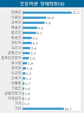 최근 한 교육관련 사이트가 초등학교 고학년 1만 명을 대상으로 ‘장래희망’에 대해 조사한 결과 연예인, 방송인, 컴퓨터 전문직, 요리사 등의 항목이 높은 응답률을 보였으며 또 ‘어떤 직업이 좋은 직업인가?’라는 질문에는 응답자의 54%가 ‘적성에 맞는 직업’에, 20%는 ‘돈을 많이 버는 직업’에 응답해 과거에 비해 학생들의 장래희망에 대한 생각이 굉장히 구체화되고 현실적이 된 것을 알 수 있다.