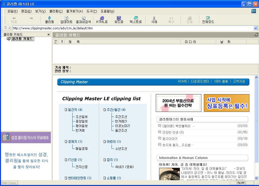 먼저 클리핑 마스터를 보도록 하겠습니다. 필요한 정보를 종이 신문에서 부분부분 잘라내어 노트나 정리할 수 있는 공간에 스크랩하듯이 Html이나 MS Office의 Word, 메모장으로 출력하여 정리할 수 있는 스크랩 프로그램입니다.